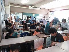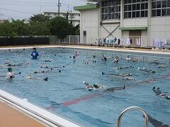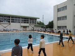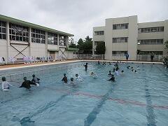 今年度の水泳学習は、今日が最後日です。最後は4年生が、水難事故に遭ったときに浮いて救助を待つ「着衣泳」の学習を行いました。