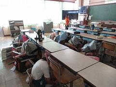防災無線から流れる緊急地震速報の訓練放送に合わせて、その場で安全を確保する訓練を行いました。