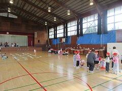 今年度は、昨日から今朝にかけての雨の影響で校庭が使えないため、体育館での開催となりました。