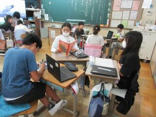 6年生は外国語の授業で学校紹介動画を作製してきました。今日は、その視聴交流会を行い、他の児童が作った学校紹介動画を見て、コメントを入力していました。他校の紹介動画を興味深く観ていました。