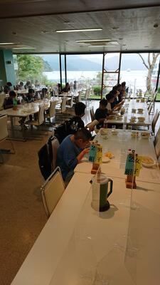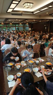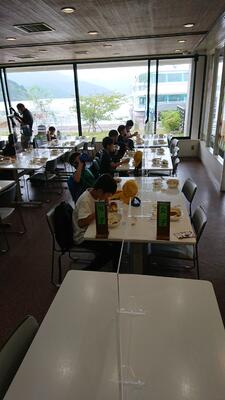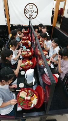 華厳の滝の見学を終えて、昼食会場に着きました。メニューはカツカレーです。みんなおいしくいただいています。このあとのハイキングにそなえて、しっかり食べましょうね。