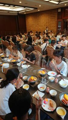 朝食時間です。食事係を中心にスムーズに準備をととのえて食べています。