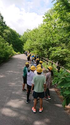ハイキングを出発しました。天気もよく、みんなも元気にスタートしました。昨日の雨のせいか、少しぬかるんでいますが、がんばって歩いております。