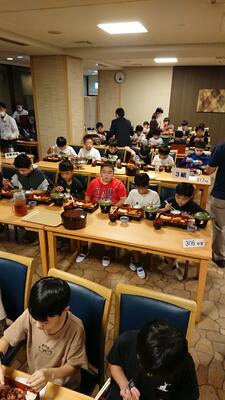 修学旅行最後の食事です。男女に分かれ、お土産の買い物と食事を交互にしています。メニューはカレーです。最後の食事も美味しくしずかにいただいています。
