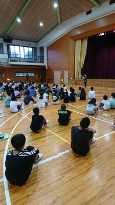 きょうの朝は、市内音楽会に参加する5年3組の壮行会を行いました。オンラインで行いましたが4年生と5年生は体育館で直接応援しました。