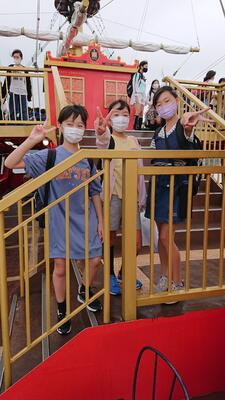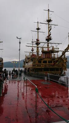桃源台港から海賊船に乗り、箱根町港に向かいます。降っていた雨もやみ、甲板にでることもできそうです。