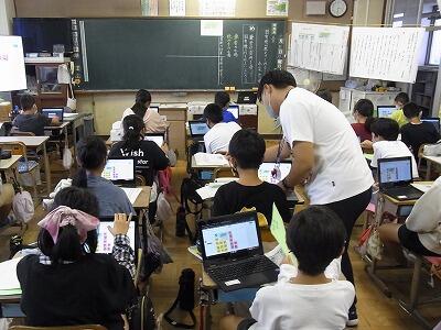 ICT機器を活用した授業にも積極的に取り組んでいます。1年生は学習端末を使用してタイピングの練習を一生懸命に取り組んでいました。6年生では、社会科の歴史学習で、浮世絵の画像を大型提示機器に映し出して学習していました。また、プログラミング学習でプログラミングした模型カーを走らせる学習もしていました。