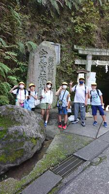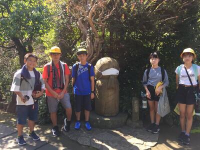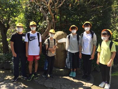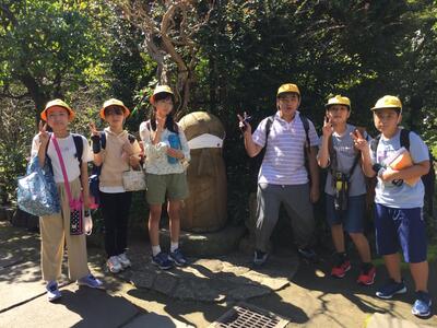 鎌倉海浜公園にすべての行動班が無事に到着しました。たくさん歩いてきたので疲れている様子も見られますが、みんな元気です。これからホテルへ向かいます。