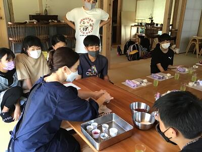 和菓子作り体験は、次のグループがスタートしました。真剣に説明を聞いて、思い思いに作ります。