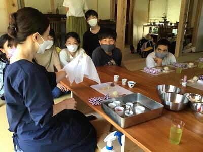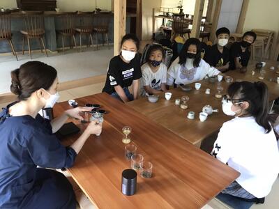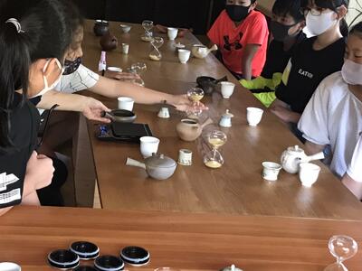 日本茶体験中です。お茶の入れ方など、教えていただきながら、より美味しいお茶になるように取り組んでいます。
