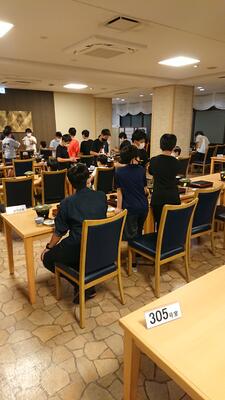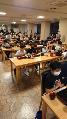 女子と男子に分かれて、女子から先に昼食をとっています。男子はお土産を買っています。