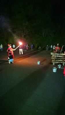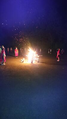 キャンプファイヤーが始まりました。火の神、火の精が炎を点火すると、大きく燃え上がりました。この炎のように、このあとも盛り上がっていきます。