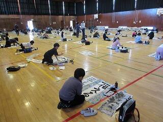 しんと静まり返った体育館で、高学年の書きぞめ競書会が始まりました。今年は、6年生が「強い決意」、5年生が「美しい空」の4文字を書きます。