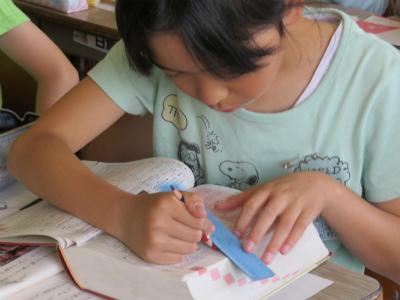 教室に入ると、ランドセルをロッカーに入れ、身の回りを整理します。大きなランドセルもきちんとしまえました。さすがですね。