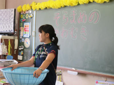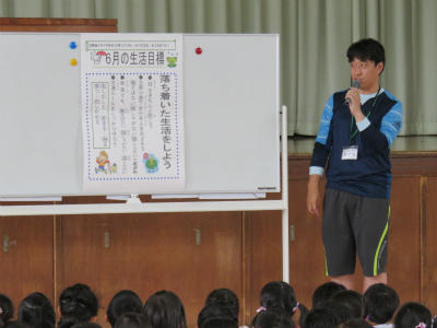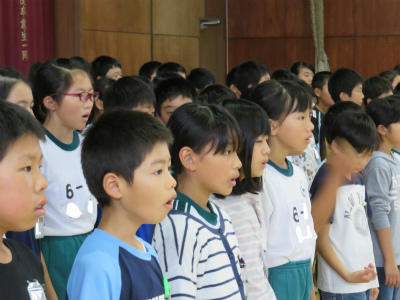 今日は、6月の歌「南風にのって」を練習しました。音楽委員、合唱部のみなさんが前に出て、合唱をリードしています。全校児童の歌声が体育館いっぱいに響きました。