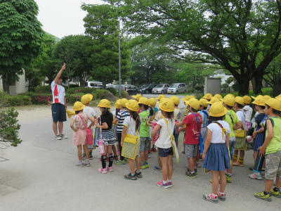 6月15日(木)朝、2年生がざりがにつりに出かけました。移動上の注意を聞いた後、元気に学校を出発しました。地域の御協力をいただいての貴重な体験活動です。みんな楽しみにしていました。網とお手製のつりざおを準備しました。鶏肉をえさにするとたくさん釣れるという話もありますが・・・。どのくらいとれたかな?