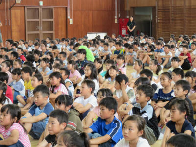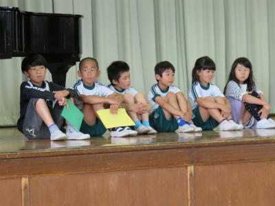 6月14日(水)朝、体育館において「イングリッシュ集会」が行われました。可野先生、ALTのキャサリン先生の指導を受けて、イングリッシュ集会係が全校児童をリードしました。小さな1年生もしっかりキャサリン先生の発音を聞き取り、元気いっぱいに活動しています。頭と目と耳をフルに使っています。先生方もリズムにのって子ども達と身体を動かしました。楽しい集会でしたね。
