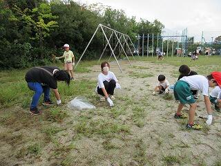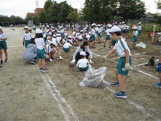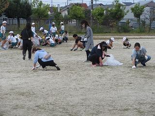 きれいで安全な校庭を作るため、全校除草を行いました。
