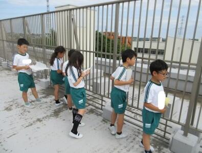 今日は、学校の屋上にあがって、学校の周りには何があるのか観察しました。