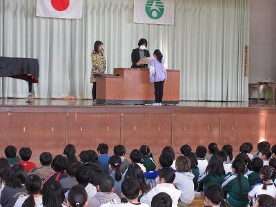児童集会の時間に「感謝の会」を行いました。日頃からお世話になっている方々を招待し、子供たちから、感謝の手紙やプレゼント、花束を渡しました。また、全校児童で感謝を込めて歌のプレゼントをしました。