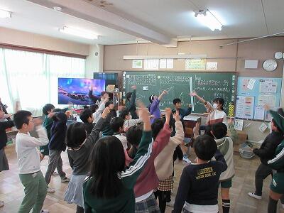 1年生の教室をのぞくと、体験入学に来た児童へ立野小学校の校歌を教えてあげようと、元気よく校歌を歌っていました。