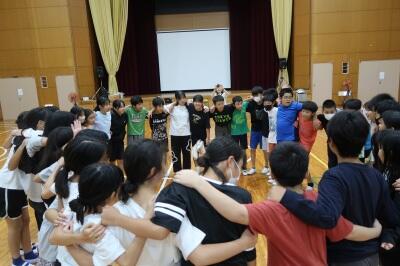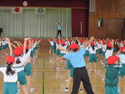 体育館では、本格的に運動会の練習が始まっていました。1・2年生はダンスの練習、5・6年生は組体操の練習をしていました。