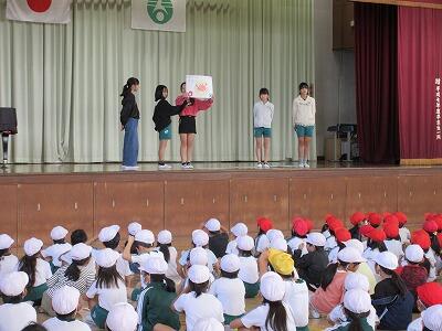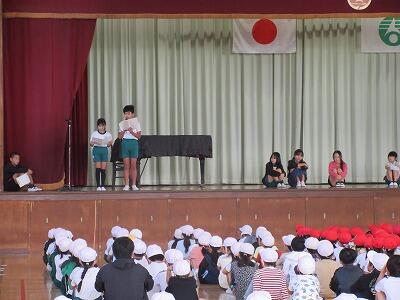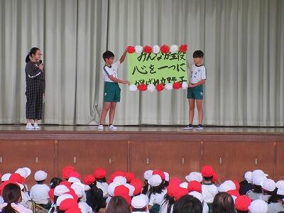 今日は児童集会がありました。代表委員からの発表です。はじめに、児童会のめあて「広げようあいさつ自慢ー明るく笑顔あふれる立野っ子ー」が発表されました。その後、ビンゴクイズで盛り上がり、最後に運動会のテーマが発表されました。今年の運動会テーマは「みんなが主役 心を一つにがんばれ立野っ子」です。