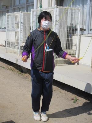 今日は、天気がいいので鈴木先生が体力づくりをかねて、二重跳びをしています。みんなもがんばってね。