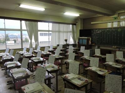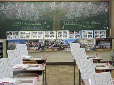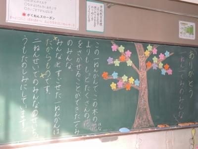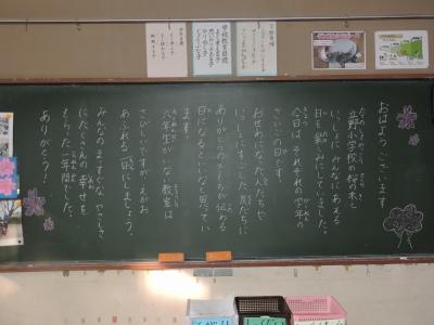 朝、6年生の教室に行ってみました。なんとも、子どもたちへの愛が溢れる教室です。校長として手前味噌ですが、素晴らしい教師集団です。愛情にあふれた担任たちです。子どもたちにとって最高の日となることを願っての、この教室なのでしょう。そして、中庭に向かう通路には6年生のその時々の決意を表す横断幕を飾っています。何時間もかけて、たくさん相談を重ねて、今日の朝を迎えたのだと思います。校長も遅ればせながら、子どもたち一人ひとりに色紙をしたためました。自分なりに考えた名前の由来です。ご両親や名付け親の気持ちに反するものでないといいのですが。丁寧にスタンドに立てかけていただきました。