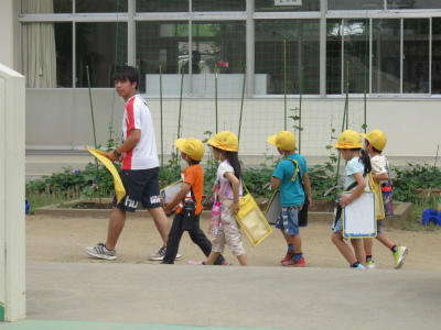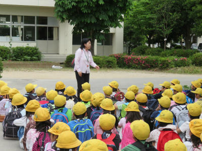 6月8日(木)2年生が「町たんけん」に出かけました。今日で3回目の探検です。出発前には、方波先生からまっすぐ1列で歩くこと、などの注意がありました。見送りの校長先生に元気よく「行ってきます」のあいさつができました。今日は、パンダ公園まで足を伸ばすそうです。