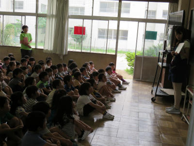 6月13日(火)8:15~体育館において、元気タイム「陸上大会報告会」がありました。体育主任の鈴木先生から、結果報告がありました。みなさん、大変よくがんばりました。