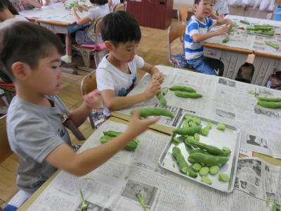 皮むきが始まると、わぁっと歓声があがりました。つやつやのさやから、大きなそらまめがたくさん出てきました。中の綿はふかふかで、しっとりしていました。校長先生も一緒にむいてみました。楽しかったね。さやは、船になります。今日、おうちに持って帰ります。楽しみしていてください。給食もきっとおいしいね!!