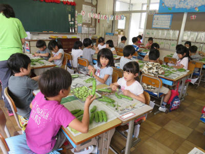 5月31日(水)1校時、かわいい1年生が「そらまめの皮むき」に挑戦しました。今日の給食で出される児童分、職員分を全部皮むきしてくれました。