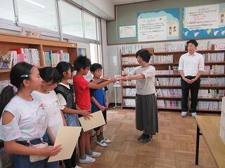 今日は、朝からかなり気温が高く、体育館で予定していた表彰朝会を、急遽オンラインでの開催に変更しました。市内陸上大会、硬筆展の代表児童と、自転車大会で頑張った選手たちに、賞状を渡しました。