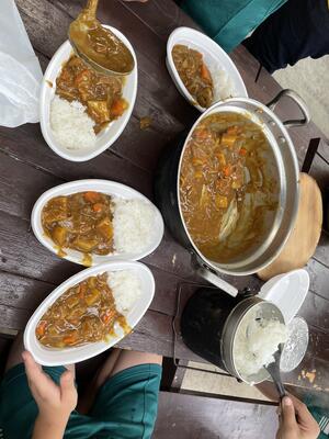 7月の林間学校では、飯盒炊爨でカレーライスを作ります。