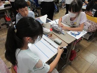 4年生が「伝える」、3年生が「みどし」の3文字に挑戦します。