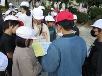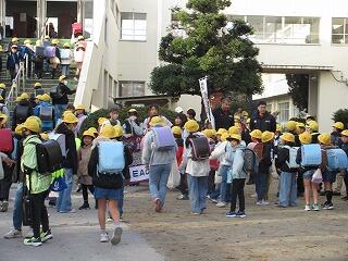 大きな地震の後、給食室から出火したことを想定し、避難を行います。煙を吸わないよう、ハンカチを口に当て、低い姿勢で避難しました。