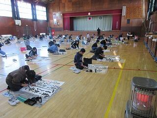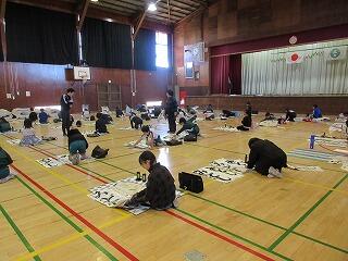 しんと静まり返った体育館で、高学年の書きぞめ競書会が始まりました。今年は、6年生が「強い決意」、5年生が「美しい空」の4文字を書きます。