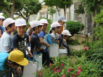 6月7日(水)埼玉県生体系保護協会春日部支部のみなさんにご来校いただきまして、4年生の「環境教育」授業が実施されました。「立野の森」に「ジャコウアゲハ」の卵を発見。大変珍しく大切に育てようとお話がありました。また、校庭に植えられた樹木には、柿、ざくろ、梅が早くも実をつけています。実ったら食べられるよ、とお話を聞き、子ども達はなんどもびっくりしていました。また、テントウムシのさなぎの抜け殻や外来種の草についても、丁寧に説明をいただき、子ども達も盛んに質問していました。生まれ育つ土地に、知識が宿り、興味が増しました。お忙しい中、ありがとうございました。