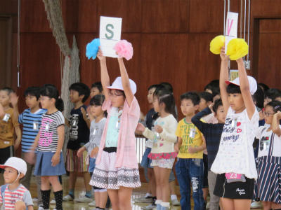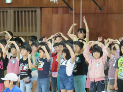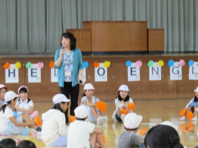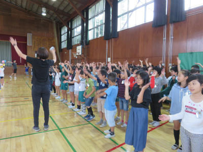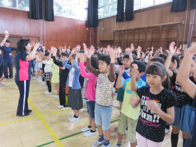6月14日(水)朝、体育館において「イングリッシュ集会」が行われました。可野先生、ALTのキャサリン先生の指導を受けて、イングリッシュ集会係が全校児童をリードしました。小さな1年生もしっかりキャサリン先生の発音を聞き取り、元気いっぱいに活動しています。頭と目と耳をフルに使っています。先生方もリズムにのって子ども達と身体を動かしました。楽しい集会でしたね。