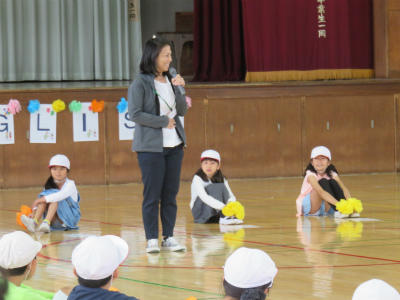 キャサリン先生の笑顔で、なごやかに楽しく集会が進みます。