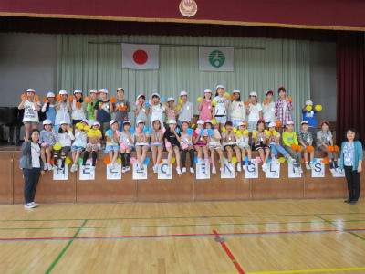 今日頑張ってくれたイングリッシュ集会係のみなさん、可野先生、キャサリン先生です。