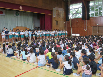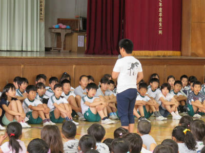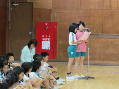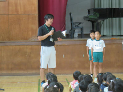 6月13日(火)8:15~体育館において、元気タイム「陸上大会報告会」がありました。体育主任の鈴木先生から、結果報告がありました。みなさん、大変よくがんばりました。
