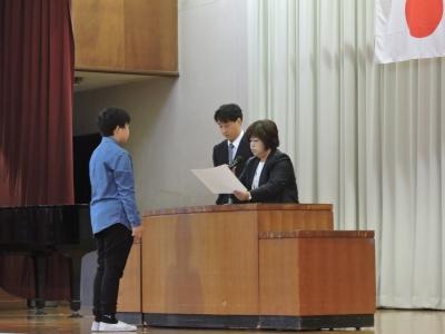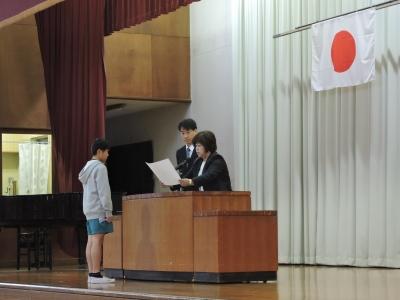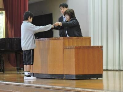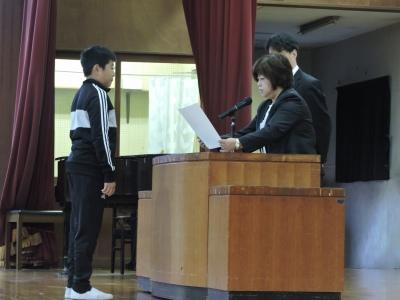 今日は、「市内読書感想文コンクール」「身障者福祉のための美術展」「郷土を描く美術展」「トラック絵画コンクール」「市内音楽会」「東部南地区音楽会」の表彰がありました。みなさん、よくがんばりました。