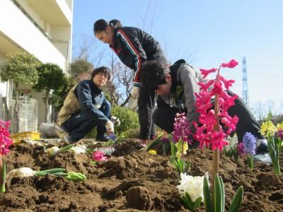 その後、たくさんのヒヤシンスを先生たちで花壇に植え替えました!花壇がとても華やかになりましたよ!いつかみんなにも見てほしいです!植え替え作業は、グラジオラスやひまわりでもやりましたね!みなさんが学校に来られない分、先生たちで頑張ります!