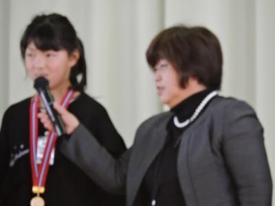「春日部郷土かるた大会」小学生の部において、初出場ながら市内の頂点に立ち「優勝」を勝ち取った3名には、壇上で校長よりインタビューをしました。札を3人で分けて覚えたこと、お母さんに読み手になっていただいて練習を重ねたこと、初めの一文字で取れるようにするなど練習に工夫をしたこと、公民館を借りて練習をしたこと、などを話してくれました。ファミリーの部で3位入賞を果たした2名からは、一生懸命練習をしたこと、緊張したことなどが語られました。