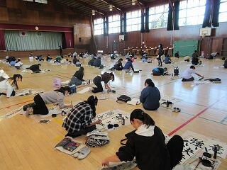 しんと静まり返った体育館で、高学年の書きぞめ競書会が始まりました。今年は、6年生が「強い決意」、5年生が「美しい空」の4文字を書きます。