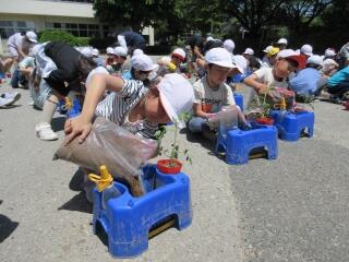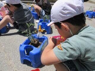 小さい手で、丁寧に苗を取り出し、植木鉢に移しかえることができました。