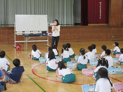 2校時は、体育館で1年生が鍵盤ハーモニカ講習会を行いました。指使いや吹き方を楽しく教えていただきました。