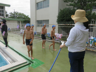 また、プール学習も熱中症予防を慎重に行っています。健康観察、水分補給、休憩の3つの声掛けをしながら、学習時間を短く切り上げています。水温が高くならないように水量を調整しながら取り組んでいます。日差しが思いのほか強いので、学校の行き帰りにも気を付けてください。水筒を忘れずに持って学習に参加してくださいね。